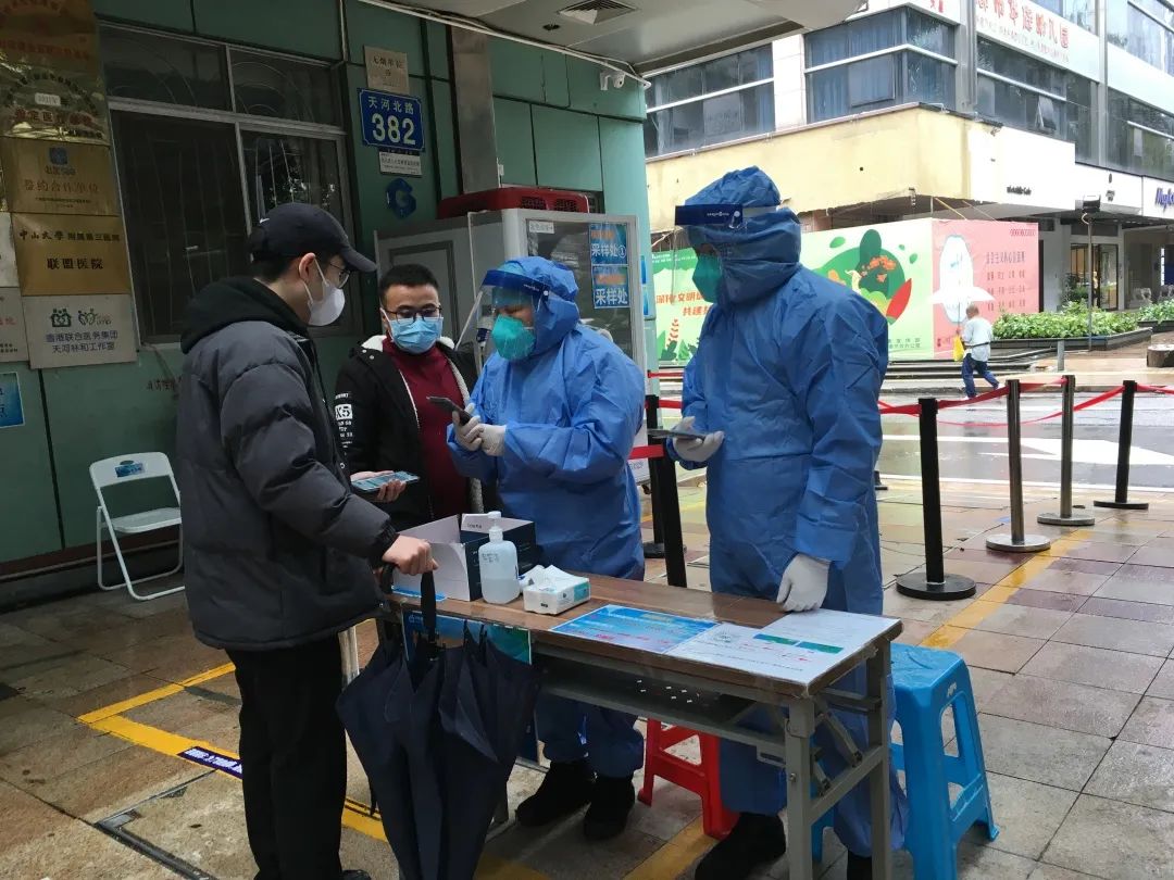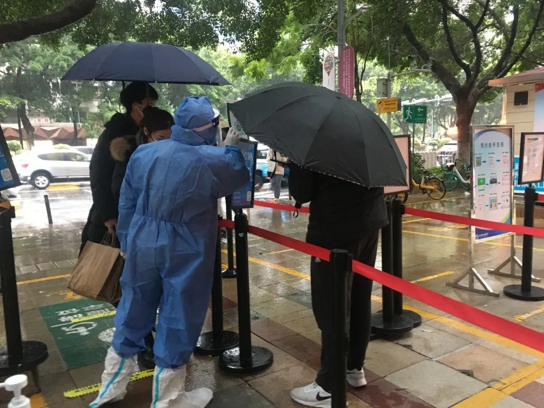 无论雨水怎么敲打,志愿者们依然坚守在核酸检测点,为市民们护航,耐心为每个市民解答核酸检测流程,做好每一个市民的检验工作。